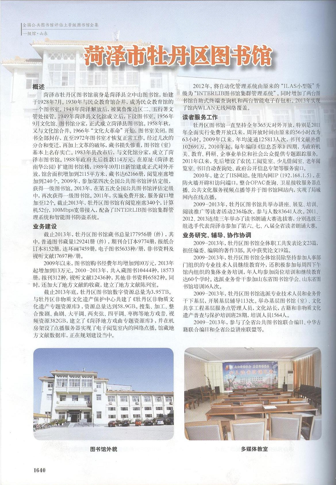 牡丹区图书馆现有工作人员16人,其中,本科学历9人,专科学历4人,中专以下3人;高级职称5人,中级职称6人,初级职称5人。藏书总量达177956册(件),其中,普通图书藏量129241册、件,期刊合订本9774册,报纸合订本8152册,连环画7459册,电子图书5633种/册,非书资料及视听文献17697种/册,数字资源总量为3.95TB。设有全国文化信息资源共享工程牡丹区支中心、尼山书院、外借部、报刊部、少儿部、采编辅导部、读者自助区七个分支机构,设有办公室、采编辅导部、普通图书外借部、过刊外借部、少儿借阅部、报刊阅览室、国学经典阅览室、盲文阅览室、公共电子阅览室、中控室、国学讲堂、少儿活动中心、陈列中心、鲁西南民间艺术品陈列室、资源加工室、传统文化体验区、数字资源借阅区和馆藏文献目录查询区等18个对外服务窗口和项目。拥有阅览座席240个,计算机52台,100Mbps宽带接入,实现了馆内WLAN全覆盖。