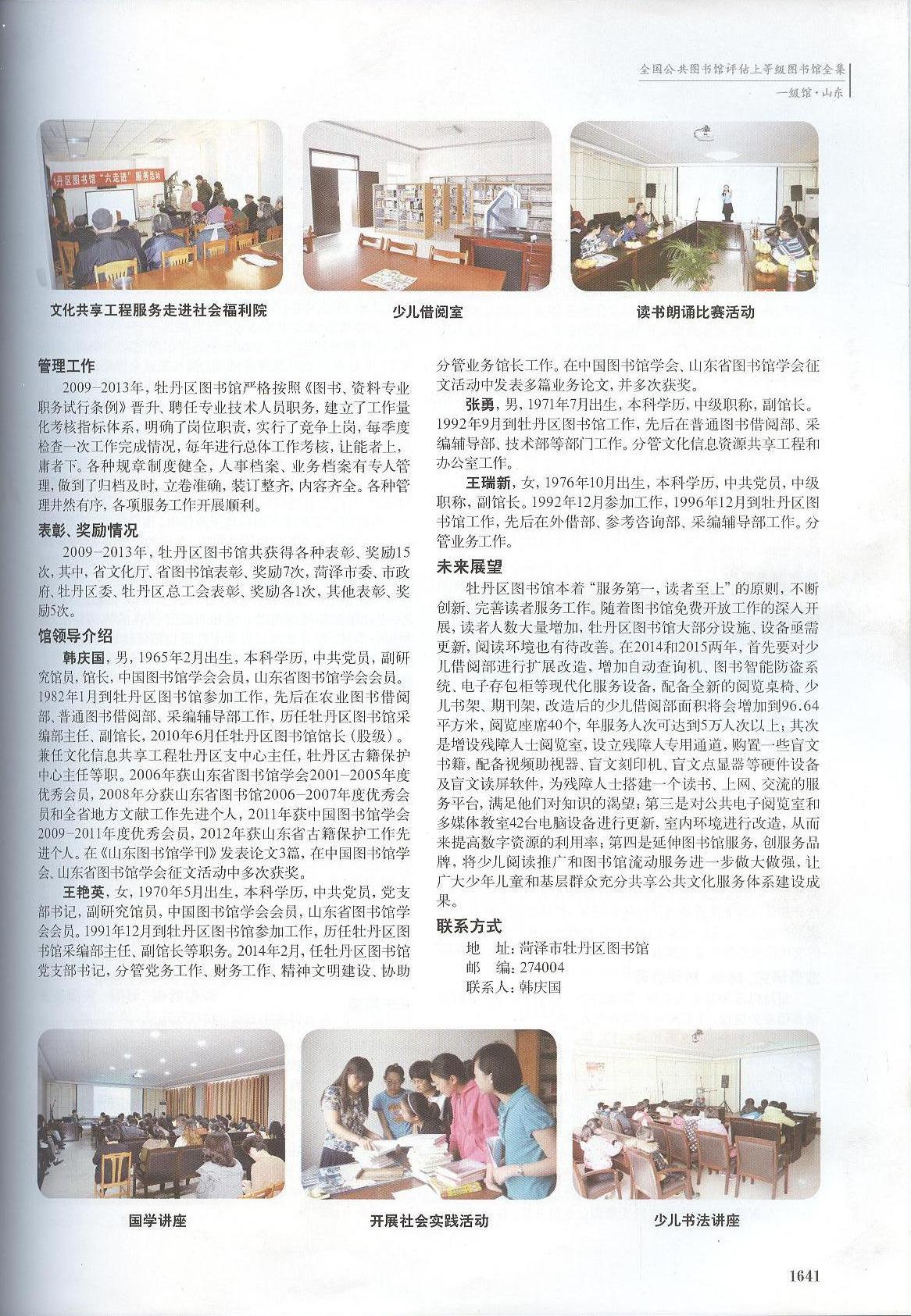牡丹区图书馆年均开展活动70余场次,包括讲座、经典诵读班、传统文化体检、展览、培训、公益电影展播、读书朗诵比赛、送书下乡、图书馆服务宣传周、全民读书月、世界读书日宣传、流动服务等,为丰富群众文化生活,提高群众文化素质,推动全民阅读发挥了职能作用。