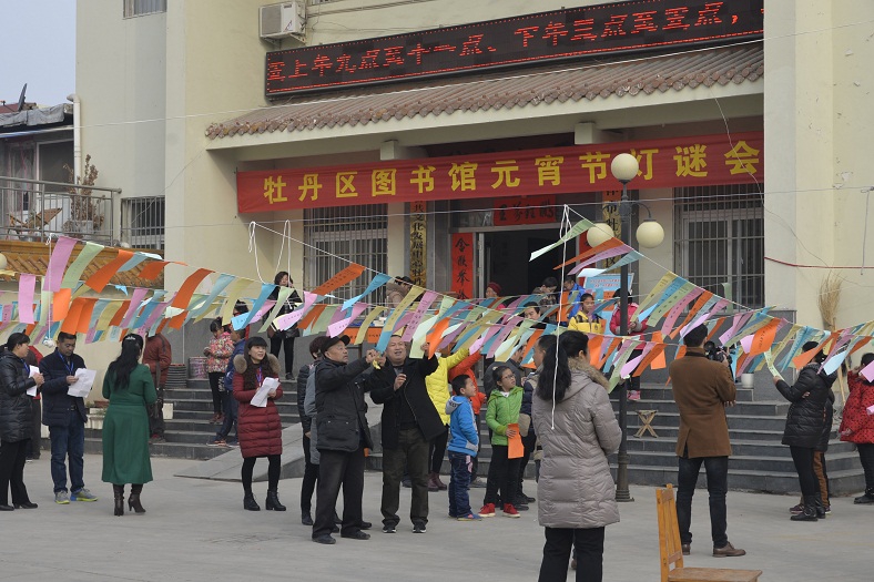 元宵节素有赏花灯、猜灯谜、闹元宵之习俗,为营造元宵节喜庆、热闹的气氛,丰富广大市民的文化生活,让人们过一个欢乐、祥和、愉快的节日。农历正月十五上午九点,由牡丹区文体局主办,牡丹区图书馆承办的集知识、趣味、娱乐于一体的、深受广大群众喜爱的元宵节灯谜会,在牡丹区文化中心拉开帷幕。此活动是牡丹区图书馆开展的2016春节主题活动之一,目前为止已成功举办了二十六届。