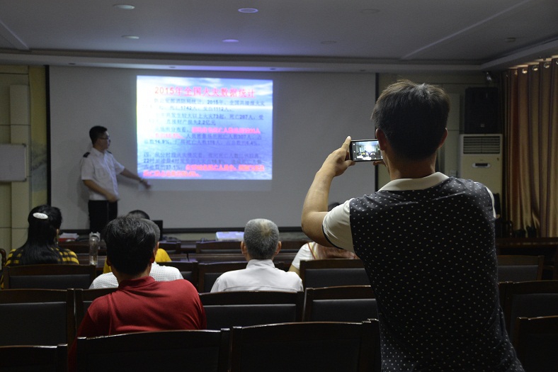 靳教官针对群众身边的消防安全问题,从消防案例入手,通过近年来全国各地发生的重大火灾,警诫人们在生产、生活中安全消防意识的重要性,分别就电器、燃气的正确使用方法与要点,消防的日常管理与检查,火灾的预防、消防器材的正确使用方法,以及火灾中疏散逃生的基本常识等,进行了系统讲解,并与同志们进行互动和现场演示。