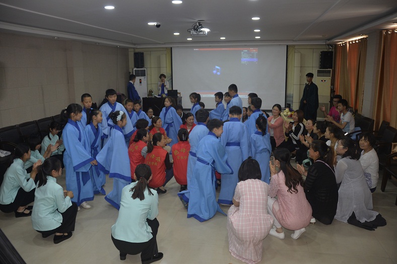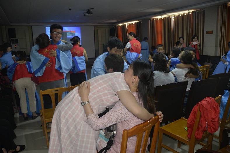 活动活动特邀日照市汉服文化协会秘书长,日照市传统弓协会副会长,菏泽正心射圃馆长为大家进行了传统礼仪讲座,特邀旺子中学老师们为大家表演了跪羊图,并开展了讲感恩故事、听感恩音乐、看感恩视频和感恩互动、游戏等活动。感恩互动环节,孩子们向妈妈深躬90度感恩礼,和妈妈深情相拥,以表达自己对母亲的感谢,感动了很多家长,个个流下了幸福的眼泪,将整个活动推向了高潮。