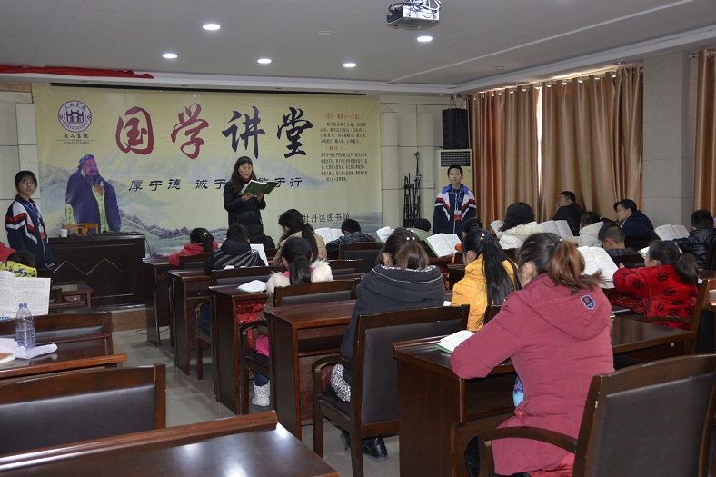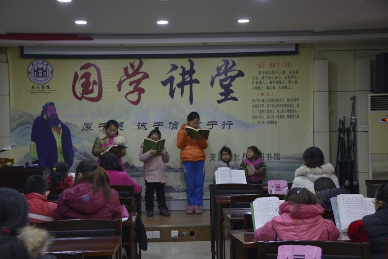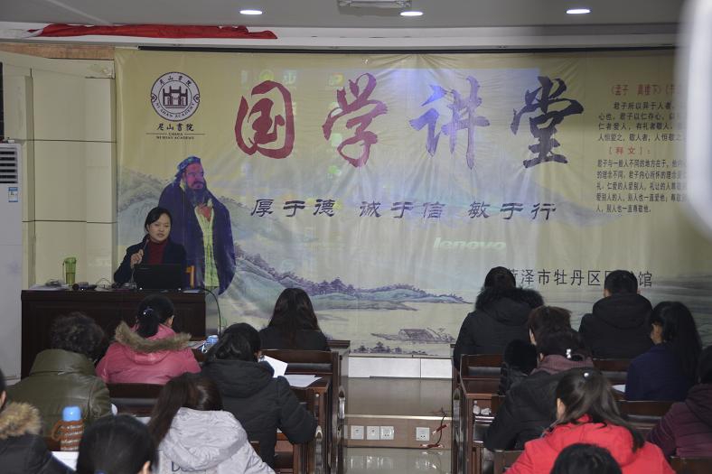 1月份,与菏泽五知书舍联合举办了书法教学座谈会;与牡丹区妇联、牡丹区家庭教育研究会联合举办了2018年家庭教育研究会年会预备会;与牡丹区正念读书协会举办了两期“文化沙龙”活动;组织全体党员及入党积极分子开展了“三会一课”和“主题党日”活动,深入学习贯彻党的十九大精神;承办了牡丹区文化系统学习贯彻十九大精神会议;举办了“爱祥国学——亲子快乐公益读经班2018年第一期师资培训”;组织菏泽一中学生开展了图书馆志愿者服务活动;分别到西城街道办事处南华社会和牡丹区第二小学开展了图书流动服务;举办了传统节日挂图展;每周六下午第五期国学亲子诵读班初级班坚持正常上课,每周日下午第五期国学亲子诵读班中级班坚持正常上课,并开展了“六端习字法”——硬笔书法体验。