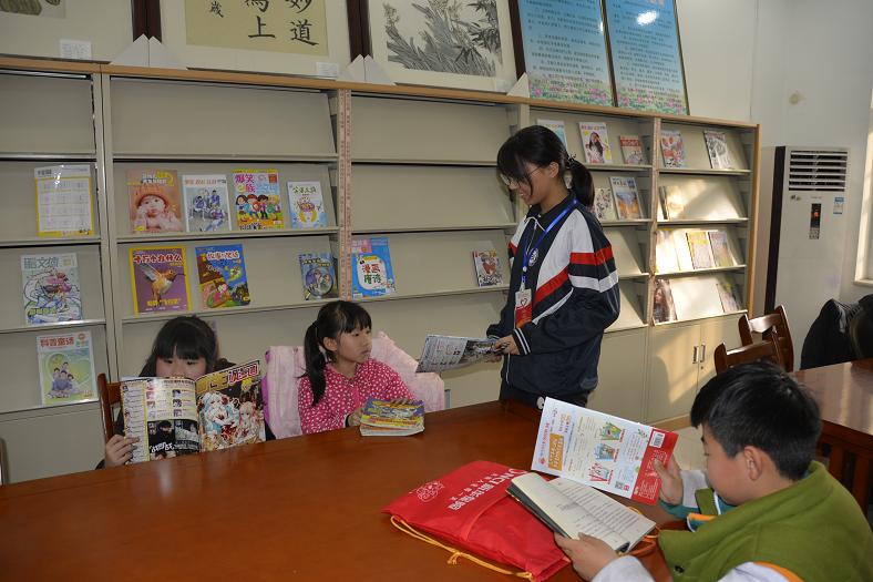 志愿者们按照馆内工作人员的分工迅速到达指定岗位为读者进行服务。两名志愿者在图书馆期刊阅览室帮助整理过期期刊,并将读者还回的期刊整理上架,馆内工作人员耐心地为他们讲解装订期刊的方法并指导他们按照顺序对杂乱无章的期刊进行整理排放。之后,两名志愿者到三楼少儿外借室进行服务,通过工作人员的指导,他们很快地熟悉了图书、期刊的借还操作流程,并且还帮助小读者们查找需要的图书、期刊,对小读者进行指导阅读服务。另外两名志愿者到图书馆一楼外借室对读者还回的图书进行整理上架,并熟悉图书管理系统操作流程为读者进行借还书服务。