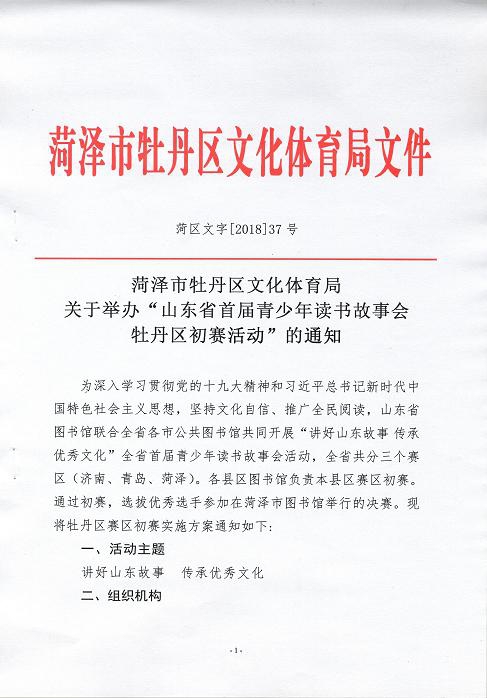 为深入学习贯彻党的十九大精神和习近平总书记新时代中国特色社会主义思想,坚持文化自信、推广全民阅读,山东省图书馆联合全省各市公共图书馆共同开展“讲好山东故事 传承优秀文化”全省首届青少年读书故事会活动,全省共分三个赛区(济南、青岛、菏泽)。各县区图书馆负责本县赛区初赛。通过初赛,选拔优秀选手参加在菏泽市图书馆举行的决赛。现将牡丹区赛区初赛通知如下: