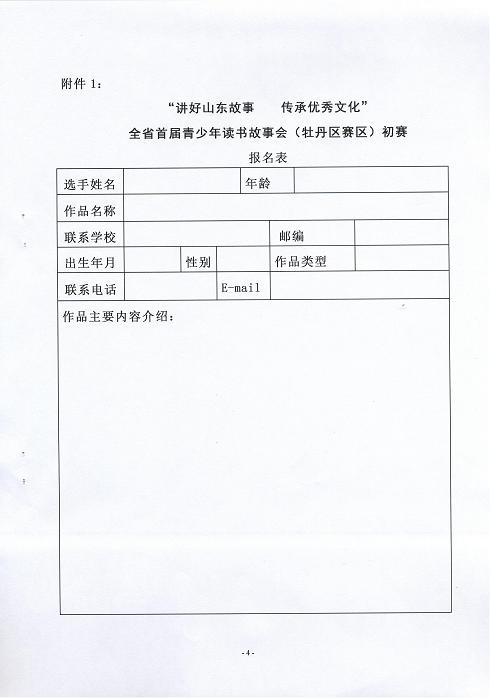 姓名、性别、年龄、出生年月、学校、联系电话,参赛作品;每组选手不超过3人,比赛时间不超过5分钟。如有配乐,需拷贝自带,并将电子版发送至邮箱hzsmdqtsg@163.com,文件名为“姓名+配乐”。选手报名成功后,初赛只能在报名赛区参加比赛,决赛统一在菏泽市图书馆进行。