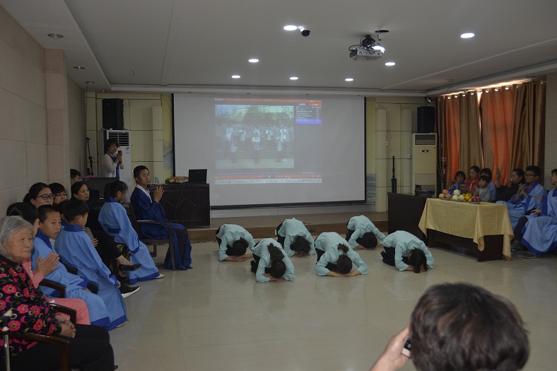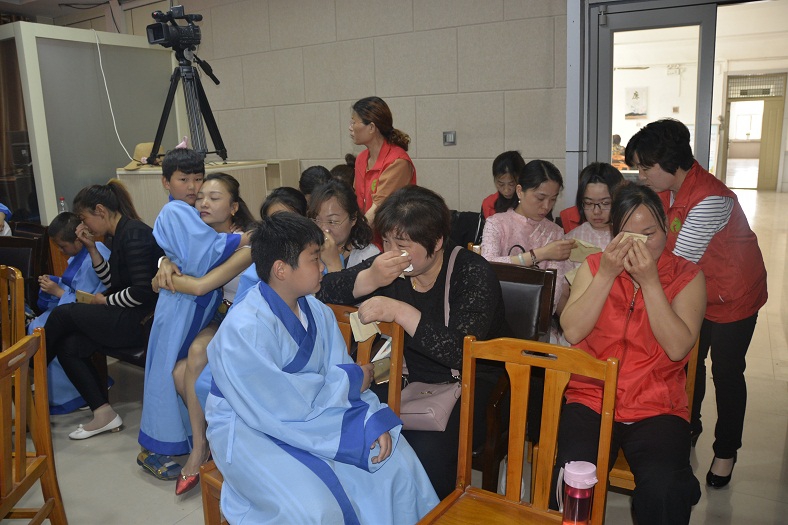 活动活动特邀日照市汉服文化协会秘书长,日照市传统弓协会副会长,菏泽正心射圃馆长为大家进行了传统礼仪讲座,特邀旺子中学老师们为大家表演了跪羊图,并开展了讲感恩故事、听感恩音乐、看感恩视频和感恩互动、游戏等活动。感恩互动环节,孩子们向妈妈深躬90度感恩礼,和妈妈深情相拥,以表达自己对母亲的感谢,感动了很多家长,个个流下了幸福的眼泪,将整个活动推向了高潮。