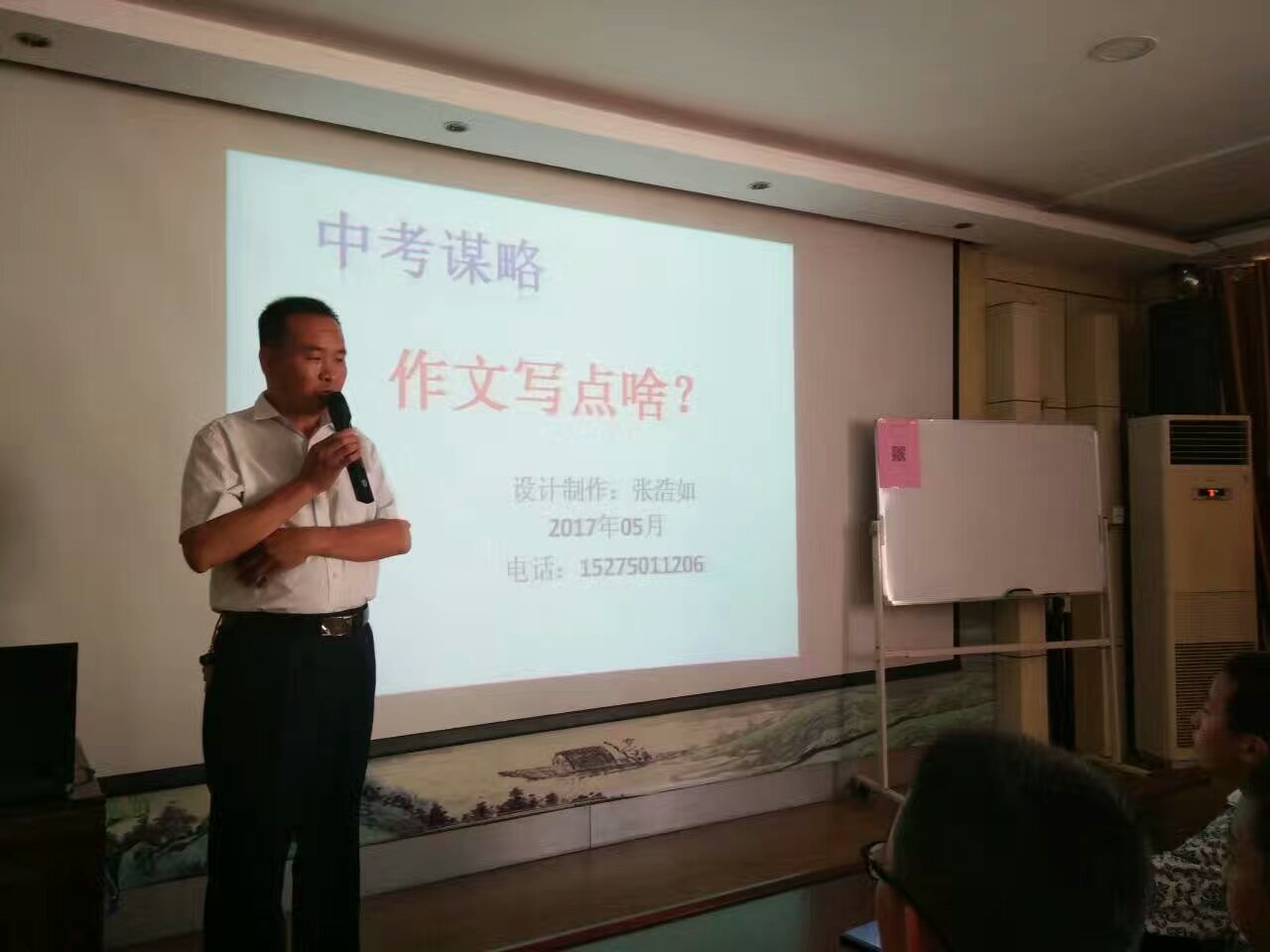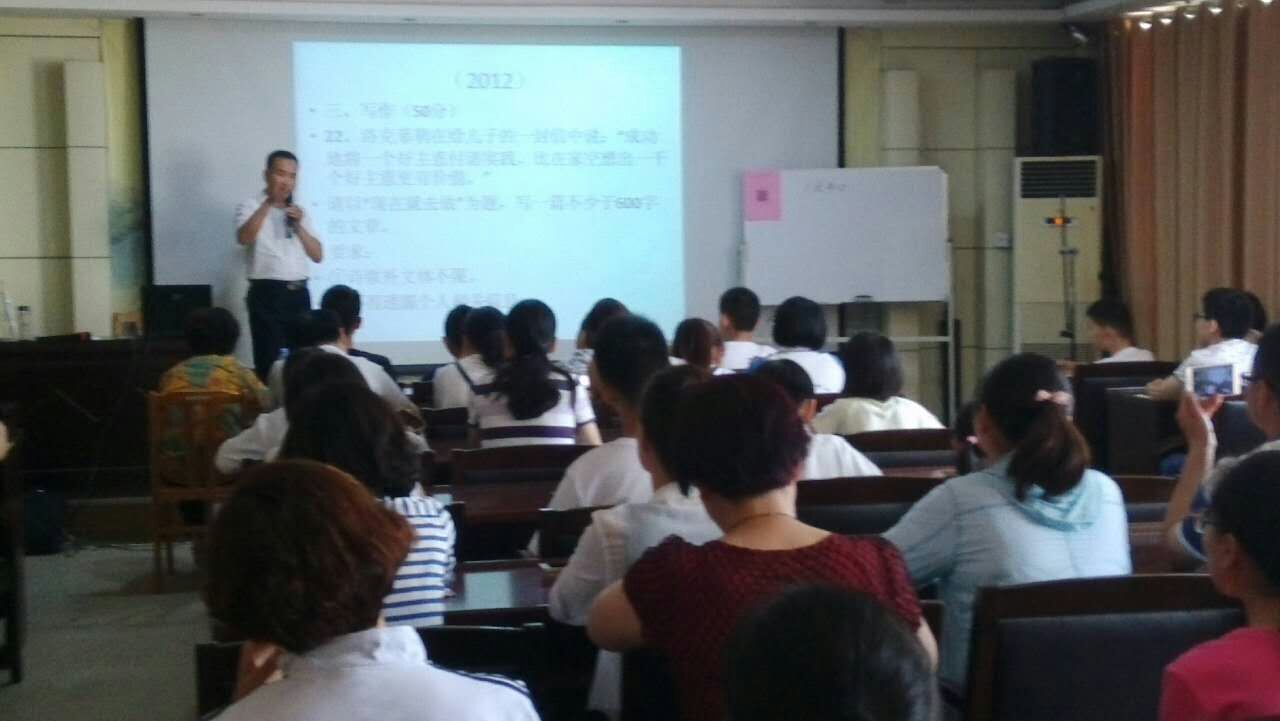 张老师的讲座从解读菏泽市历年的中考作文走势谈起,将作文题目进行汇总、归类,从中归纳出中考作文命题特点和规律。他谈到写作要有针对性;要善于灵活运用,要学会迁移、变通;要反复修改,尽可能达到一类卷评价指标。象如何确定写作对象、写作对象的特征、用什么样的事例、用什么写法去写以及评卷老师主要看什么等等,对于作文中的细节安排、用句讲究及整体构思中的写作技巧,张老师也都娓娓道来。还列举了一位同学平时作文一般,经过努力,参加中考作文喜获满分的成功案例。
