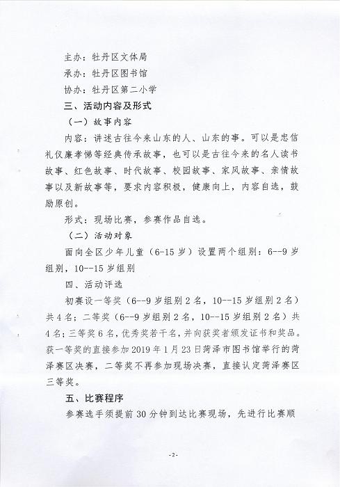 为深入学习贯彻党的十九大精神和习近平总书记新时代中国特色社会主义思想,坚持文化自信、推广全民阅读,山东省图书馆联合全省各市公共图书馆共同开展“讲好山东故事 传承优秀文化”全省首届青少年读书故事会活动,全省共分三个赛区(济南、青岛、菏泽)。各县区图书馆负责本县赛区初赛。通过初赛,选拔优秀选手参加在菏泽市图书馆举行的决赛。现将牡丹区赛区初赛通知如下: