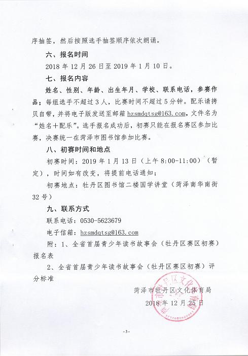 姓名、性别、年龄、出生年月、学校、联系电话,参赛作品;每组选手不超过3人,比赛时间不超过5分钟。如有配乐,需拷贝自带,并将电子版发送至邮箱hzsmdqtsg@163.com,文件名为“姓名+配乐”。选手报名成功后,初赛只能在报名赛区参加比赛,决赛统一在菏泽市图书馆进行。